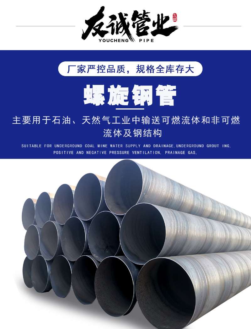 螺旋鋼管是以帶鋼卷板為原材料,經(jīng)常溫?cái)D壓成型,以自動(dòng)雙絲雙面埋弧焊工藝焊接而成的螺旋縫鋼管。